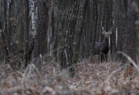 横の林に立派な角ヲ持つシカが2頭。左の木の横にも1頭いるのですがみえますか??何故か今年は大きな雄鹿ばかり見かけますが・・・・。