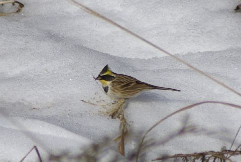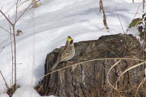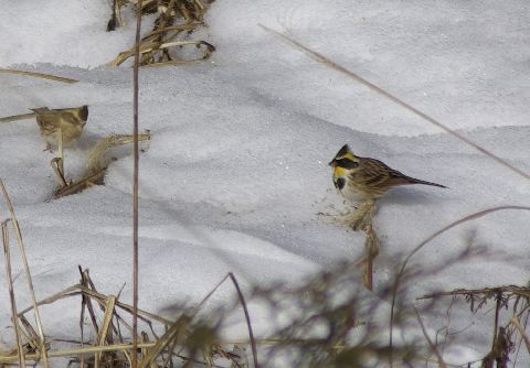 暖かな日差しを浴びてミヤマホオジロのつがいが雪の上を、何かをついばみながら、戯れています。穏やかな午後のひととき・・・・。