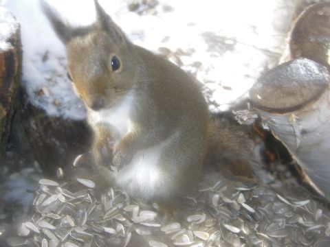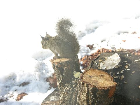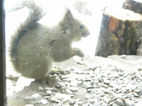 気温は1度。太陽の光がないせいか、肌寒く感じる朝です。いつものようにリス君の朝食のの時間です。ダイニングのガラス戸のすぐそばで、私達が覗いていても、無心にヒマワリの種を食べています。その可愛いしぐさを見ていると飽きません。テレビも新聞もギョッとする恐ろしい事件ばかりですので、こういう動物の姿を見ているとホットします。