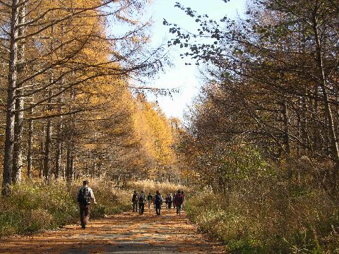 暖かなハイキング日和に恵まれて信玄棒道ウオークに参加。黄金色に輝くカラマツを見ながら、林の木漏れ日