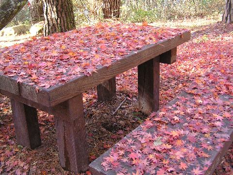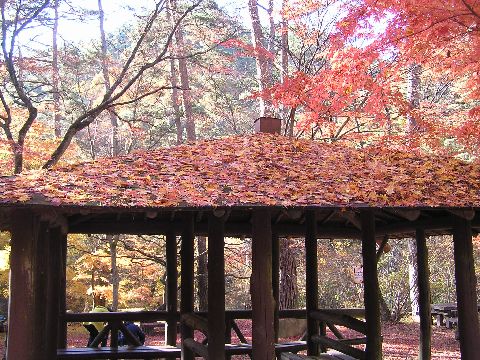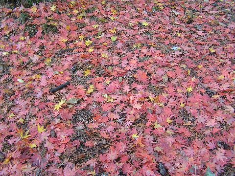 駐車場の少し手前にモミジばかりの休憩場所があり、赤や黄色の落ち葉の絨毯で、一面が覆われていて、木のテーブル・椅子・あずまやの屋根までもがモミジの葉で覆われていて、もうビックリしました。こんな光景は今まで見たことがありませんでしたので・・・・。まさに一期一会の世界でした。