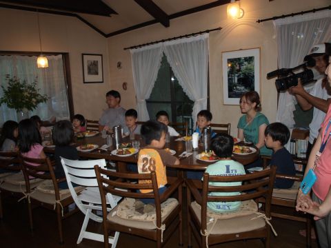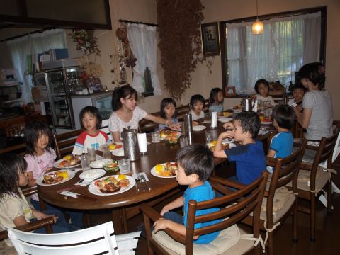 お風呂も入り、夕食の時間です。お祈りが終わりにぎやかにはじまります。奇麗に食べる子、ご飯のお代わりをする子、とても楽しそうですが、先生は、もう大変・・・・。あと花火をしてオヤスミです。