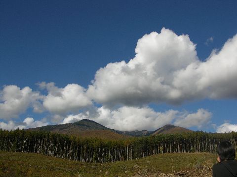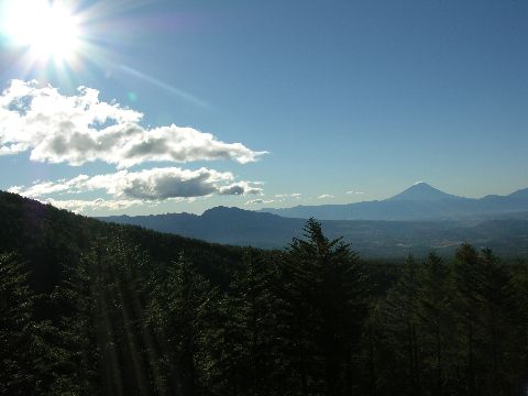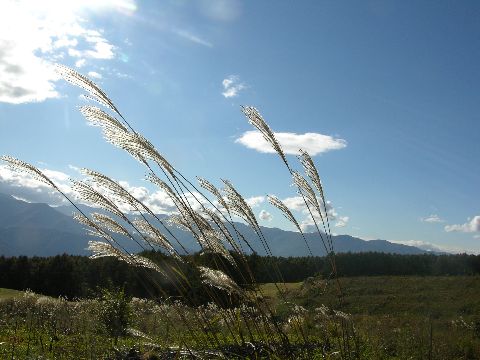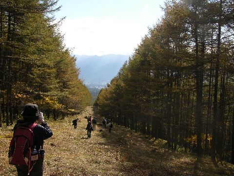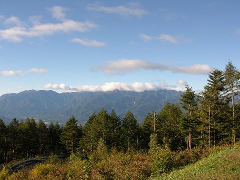観音平から広い防火帯を降りるころは又晴れてきて八ヶ岳もみえすすきの向こうには雄大な南アルプスも!!。さらに下って県営牧場まで、富士山は残念ながらほんの少しだけ・・・朝は富士見平から見事な富士が見えたのに・・・・・。