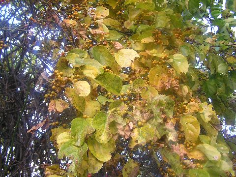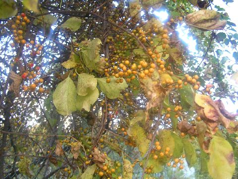 散歩の途中いつも頂くお宅のツルウメモドキがもう沢山の実を付けているのを見つけ、早速頂いてきて昨年のものと取り替えました。明日になれば弾けて赤い綺麗な身が出ていることでしょう。