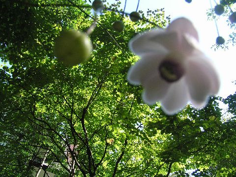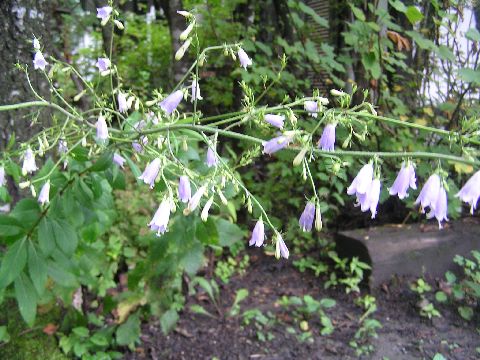 青い蕾の期間が随分長かったのですがやっと薄い紫色になりそろそろほころび始めました。うつむいてさいています。下からソット顔を覗いてみました。