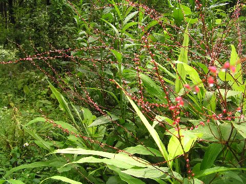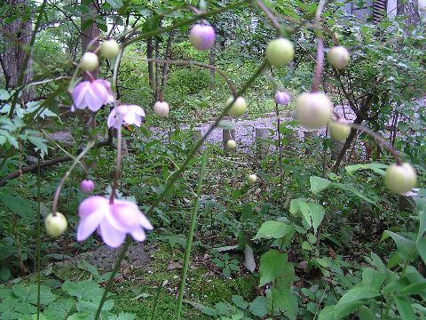 ツリガネニンジンが咲き始めました。背が伸び過ぎて横になりながら咲いています。これも増えて欲しい花ですがなかなか・・・・・。アザミも咲き始めましたが種類が多く詳しい名前まで解りません。ミズヒキソウもあちこち好きな方に延びて交差しながら咲いています。