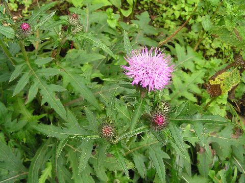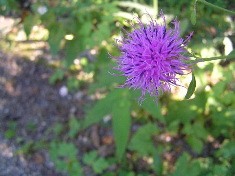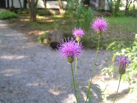 ここ2.3日すっきり晴れず、むしむしと暑い日が続いています。庭ではタムラソウが咲いています。アザミとは違って葉にとげがなくて可愛い花です。