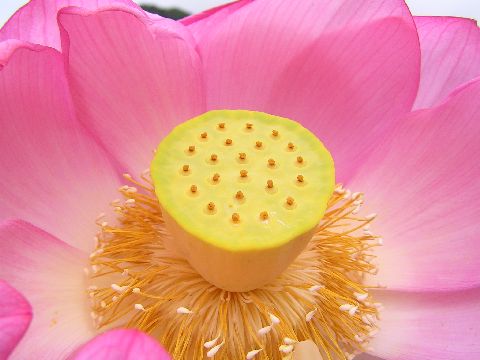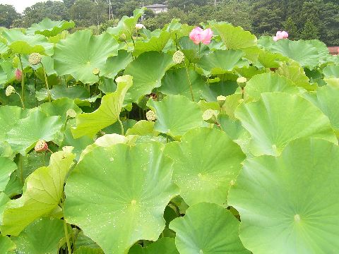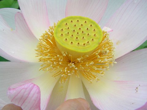 大阪からのリピーターさんが蓮を見たいとの事で出かけましたが最盛期の頃の華やかさはないものの、蕾もあり咲いている花もあり、花のシンが黄色でこれはお客様も初めて見たと喜ばれました。この黄色のシンがはなびらが散り落ちるとだんだん緑色に変わり又茶色に変わるようです。私も今年始めて何回も見てそれに気が付きました。もう種ができはじめているものもあり、今頃行くのもいろいろな状態が見られてなかなか楽しかったです。